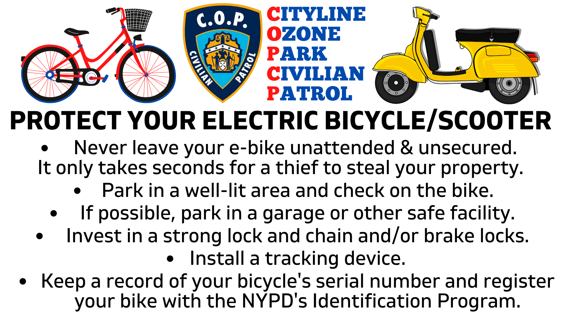 Robberies of electric bicycles and scooters have been on the rise lately. Just last week, our COPCP volunteers witnessed a robbery and were able to help recover an electric bike